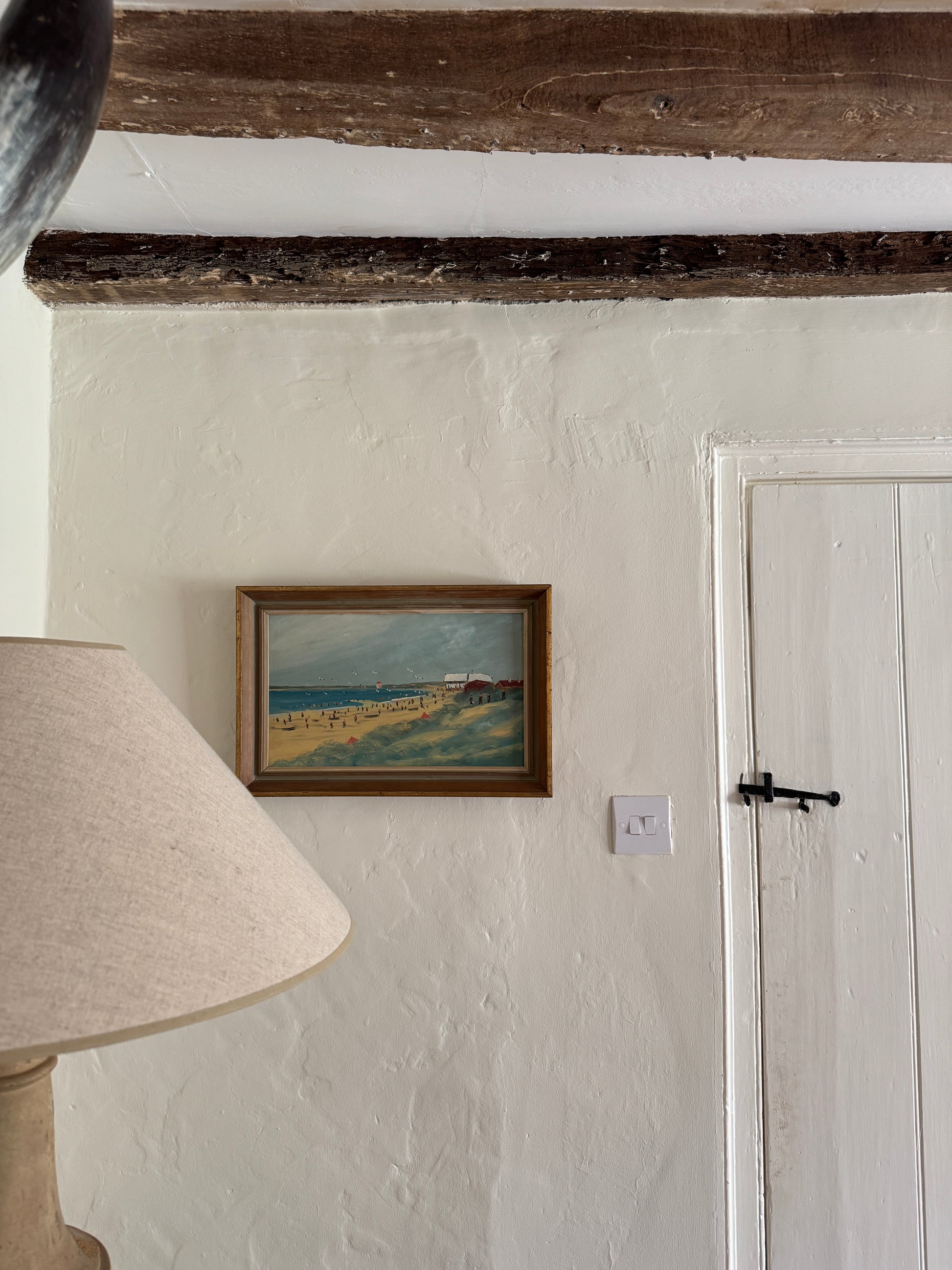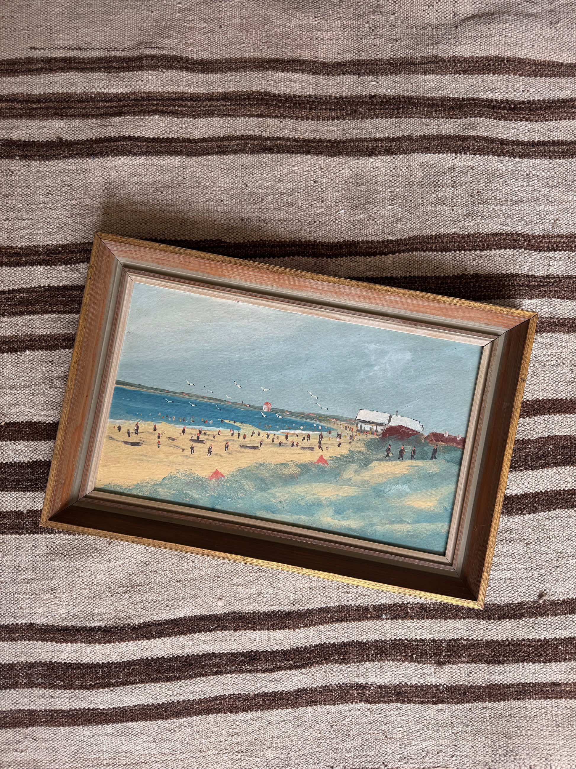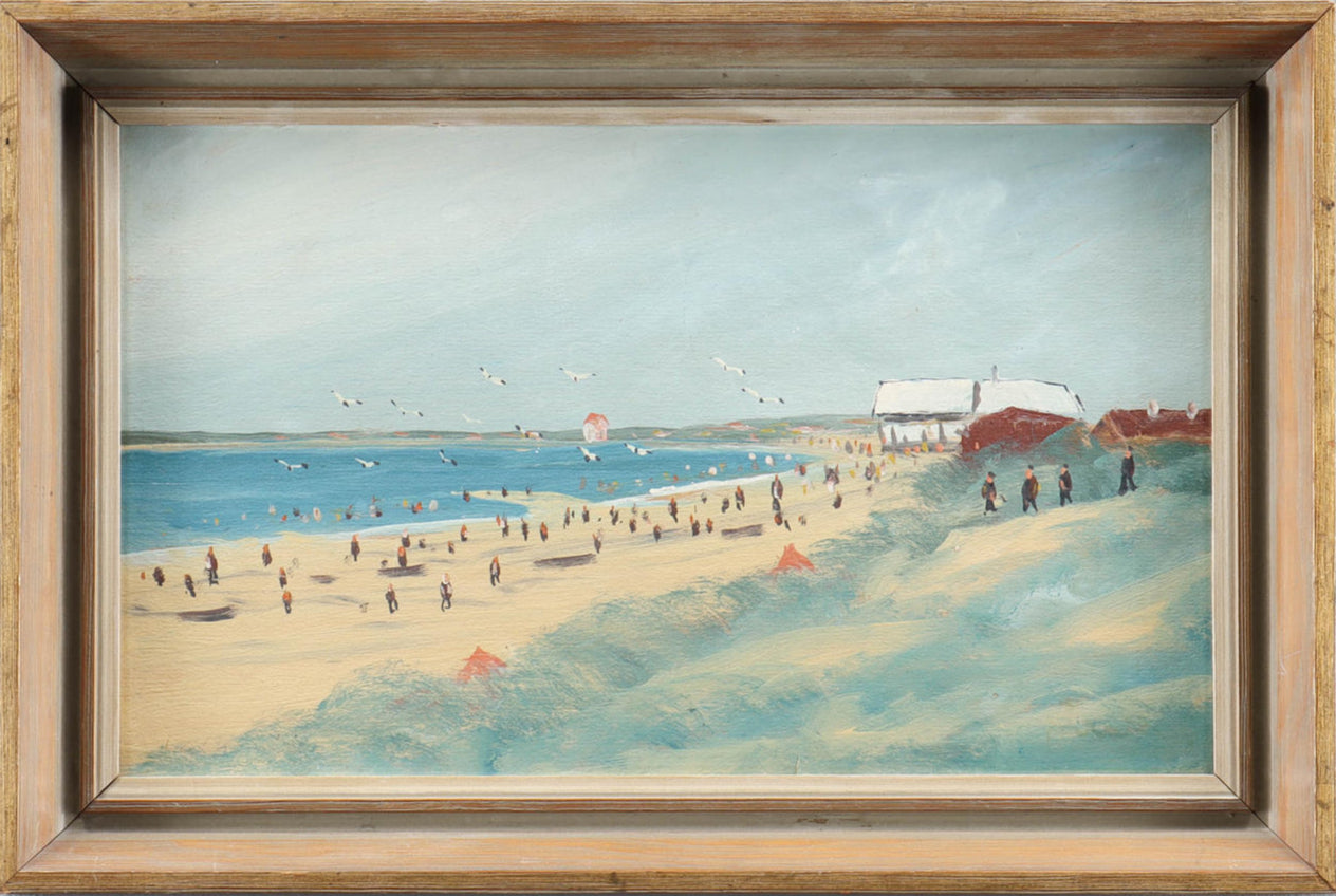 Charming landscape of beach scene with seagulls, flying kites and a beachgoers. In beautiful lightly gilded wooden frame.