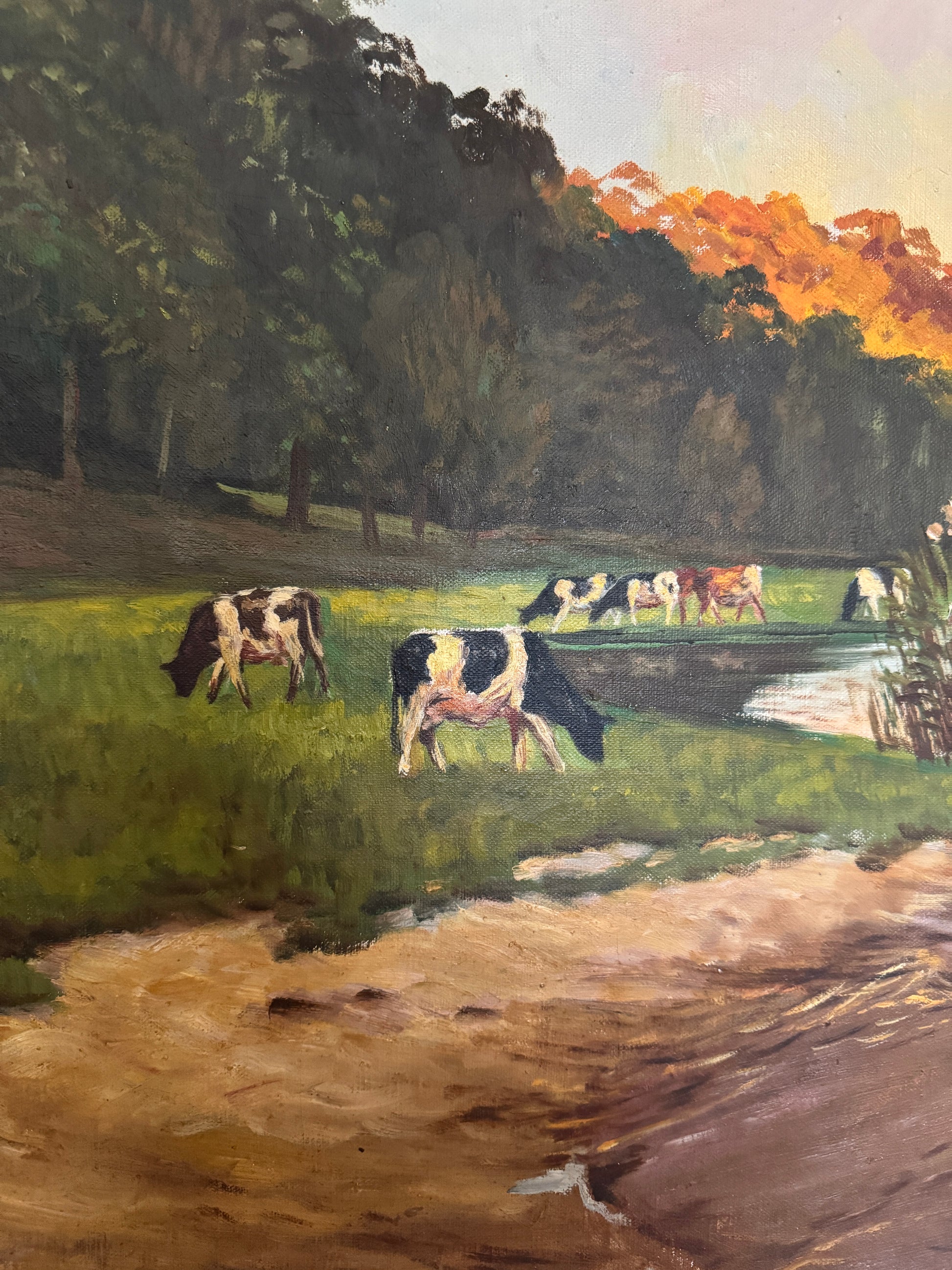 Charming large landscape painting featuring cows on the banks of a lake with autumnal tones.