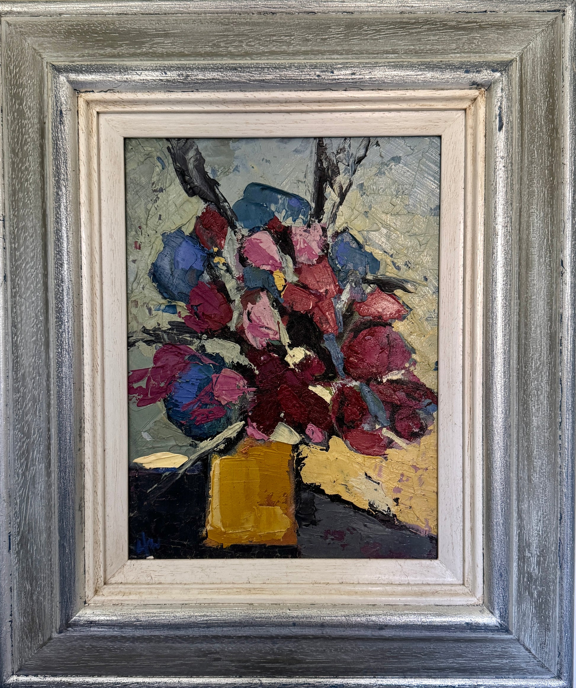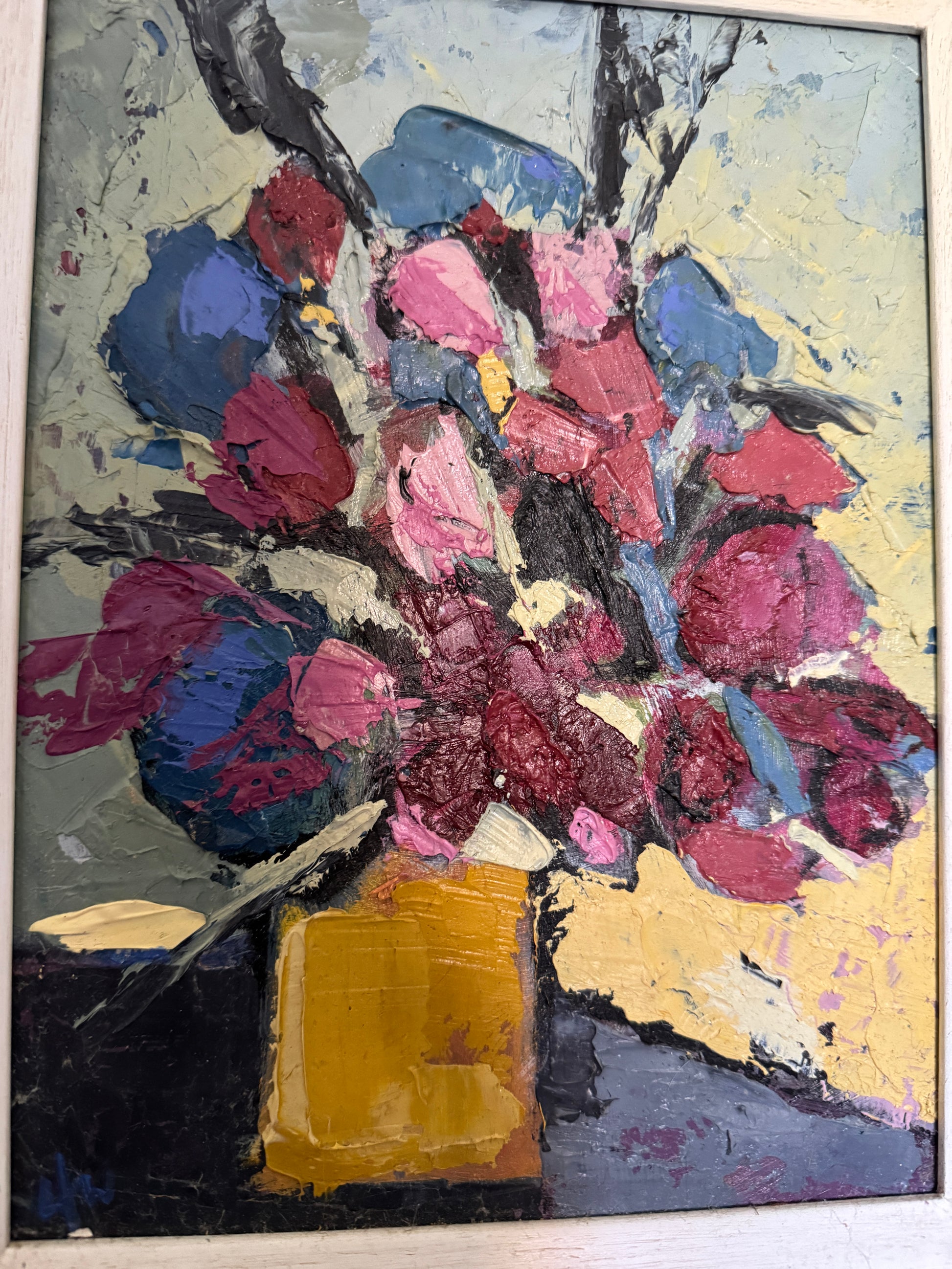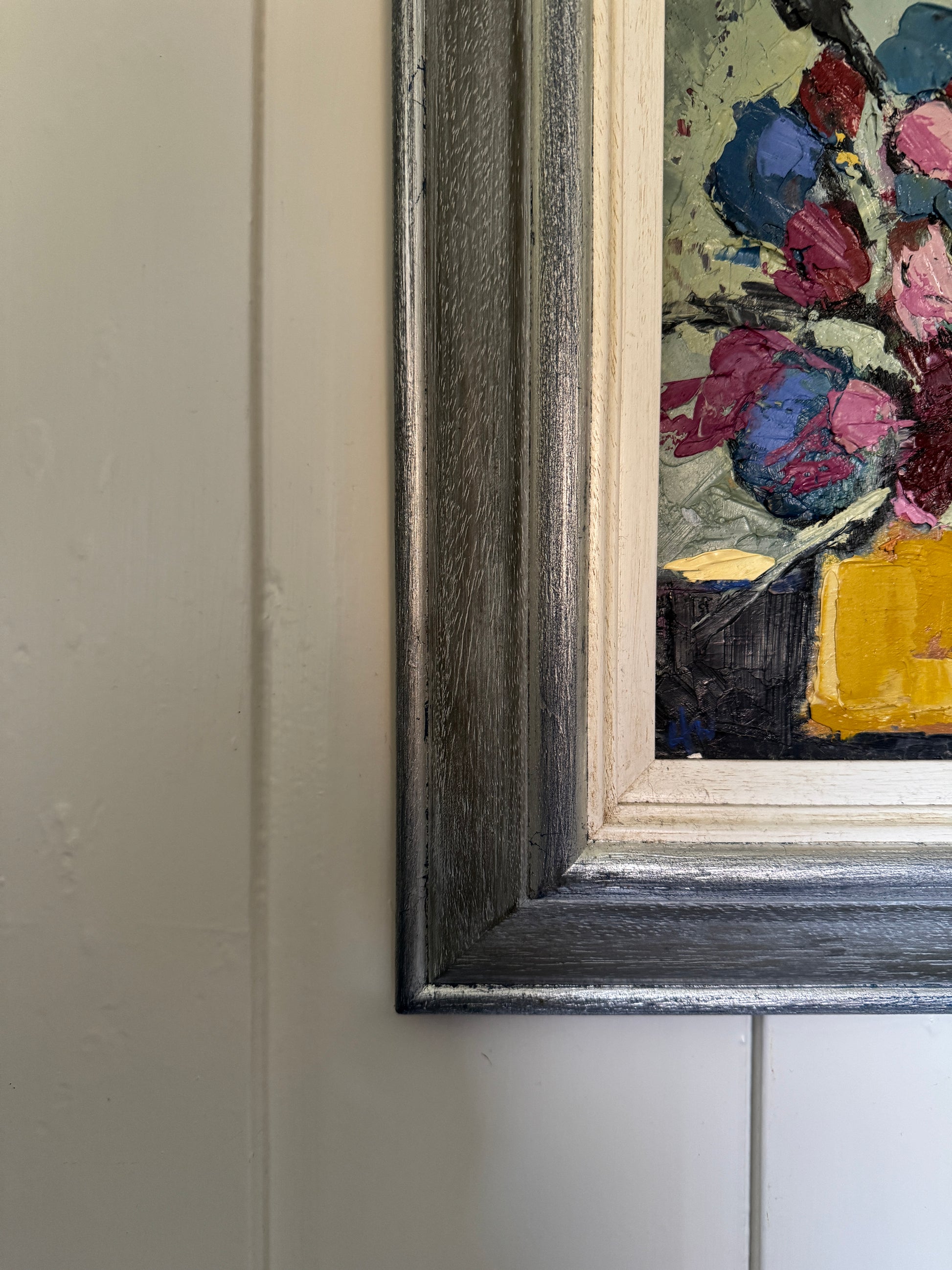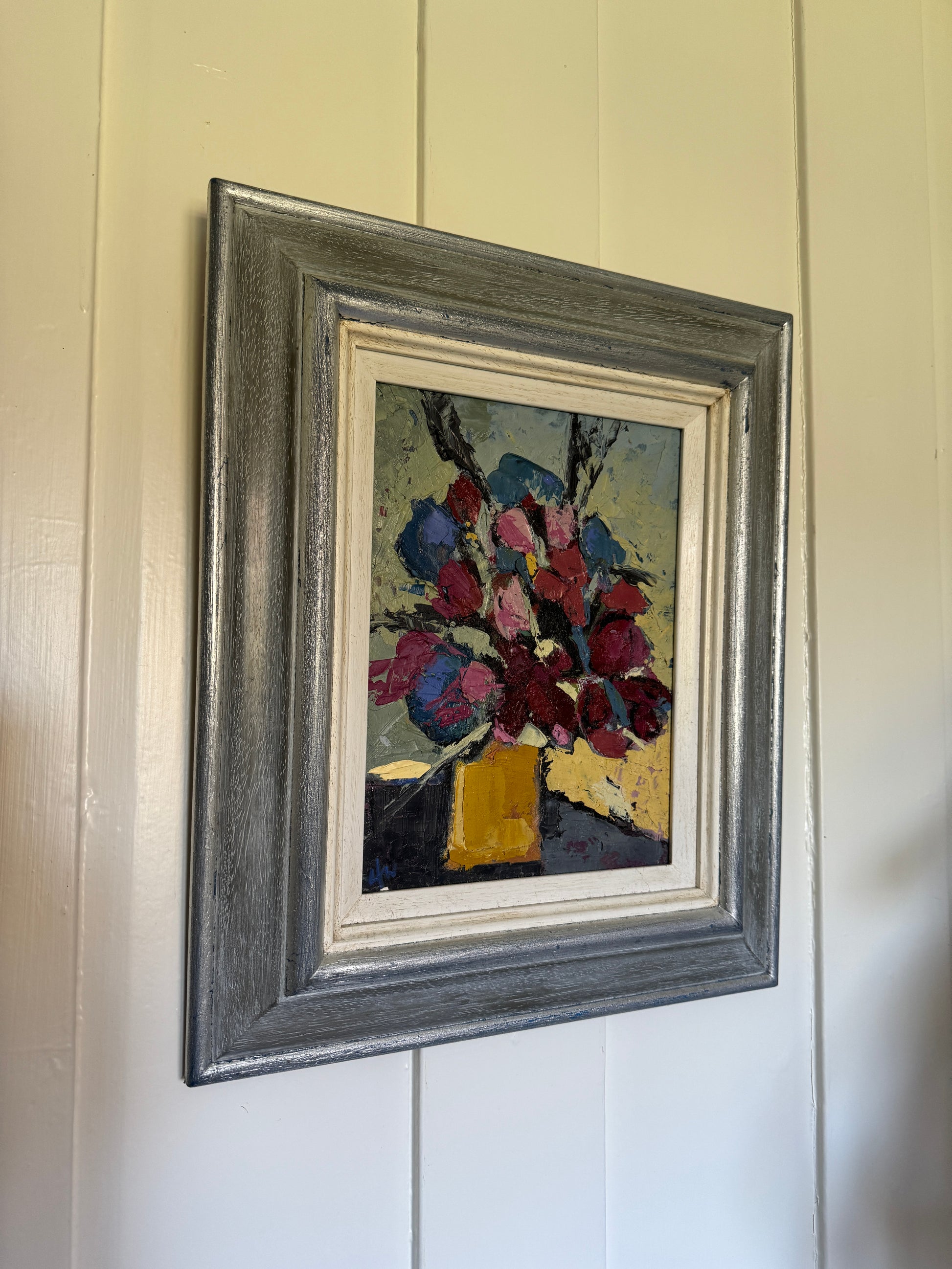 Charming oil floral still life. Thick expressive brushstrokes. Distressed silver wooden frame.