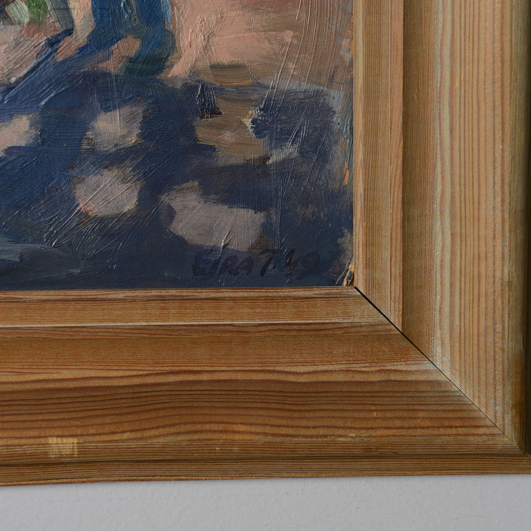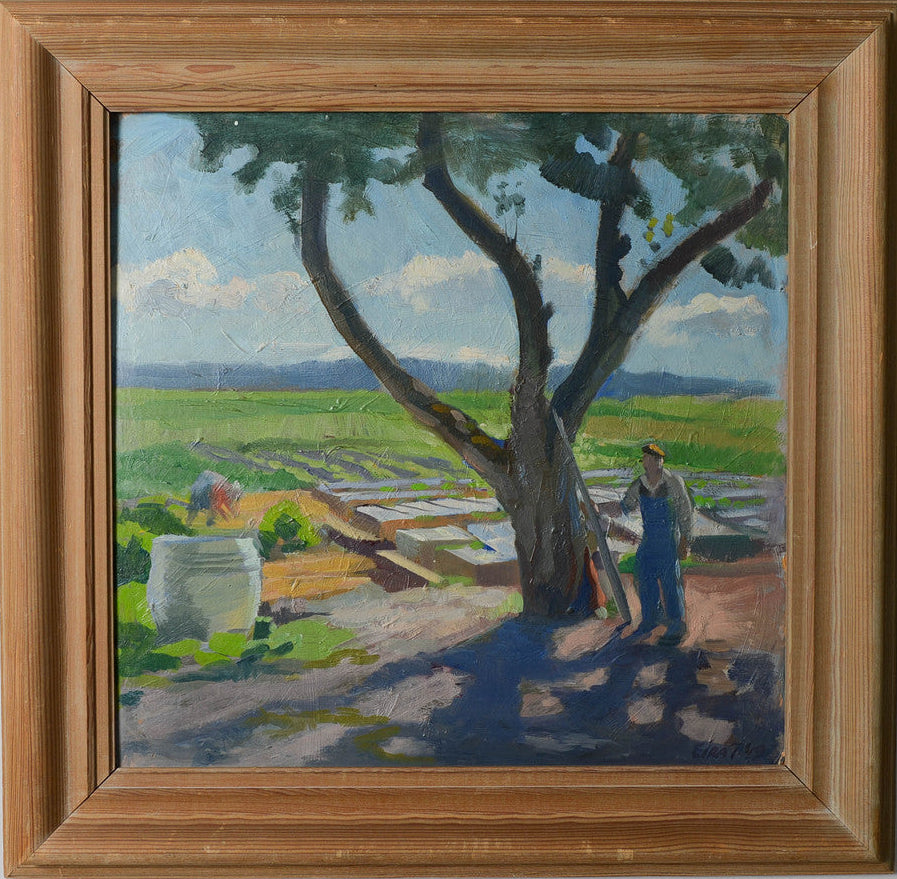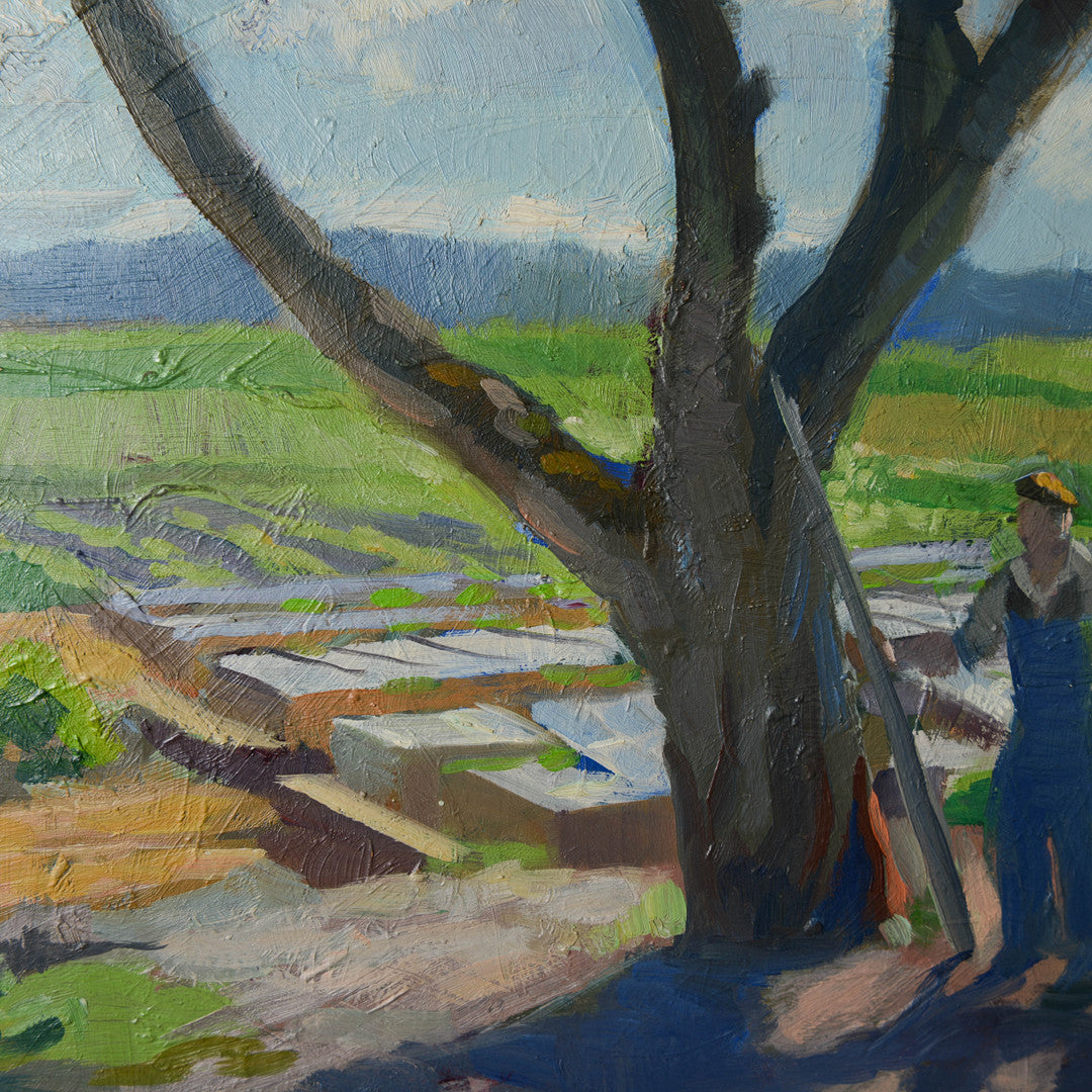 Charming scene featuring a man and woman tending to a vegetable patch and tree. Beautiful soft tones in the colour palette.